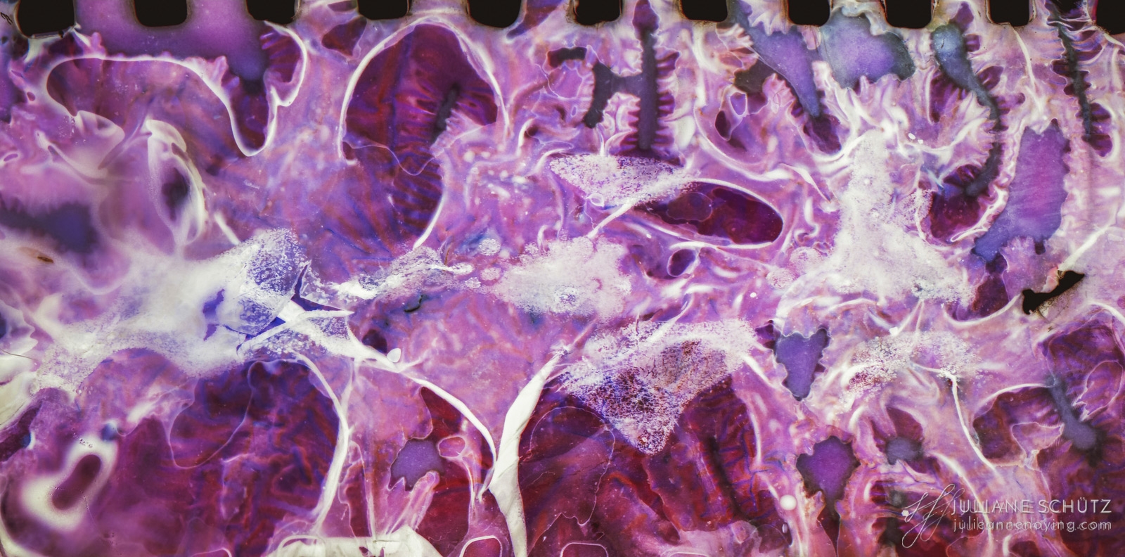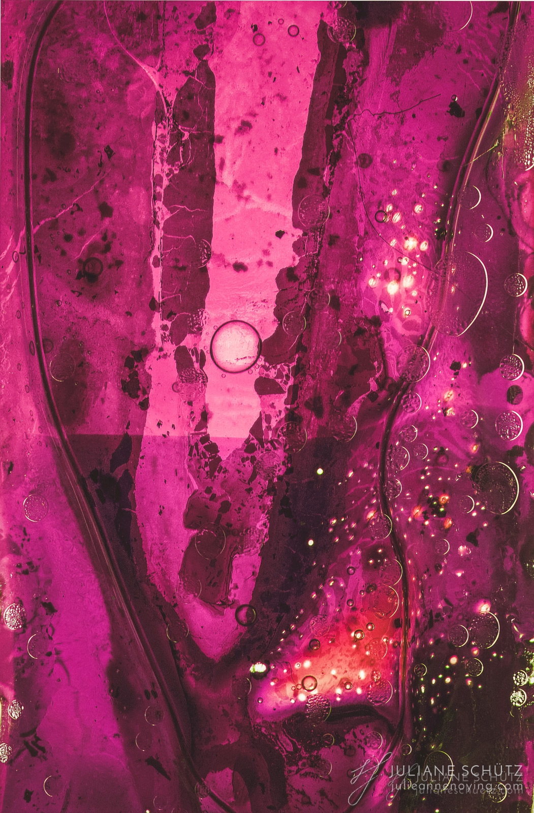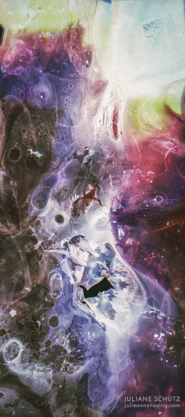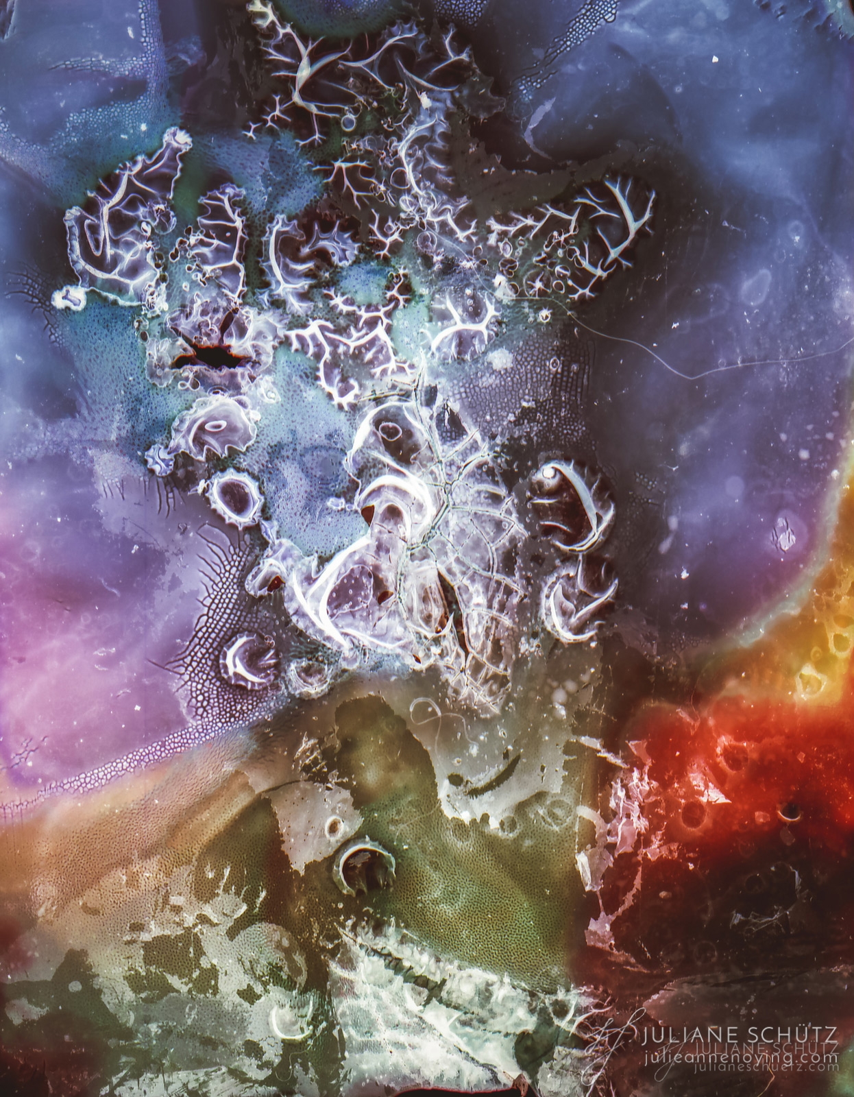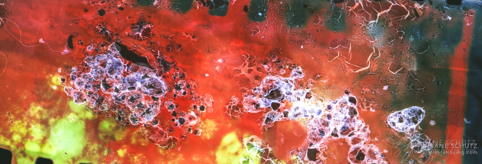 In contrast to normal use where the film is used as a canvas for a photographer's vision of the world, Schütz explores a new and different form of "life" by allowing the film to develop its own form of expression through analog manipulation using household chemicals such as ammonia, vodka, chlorine, acetone, soda and fire.