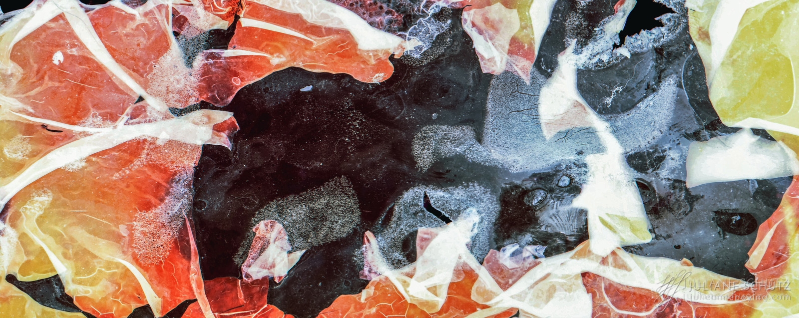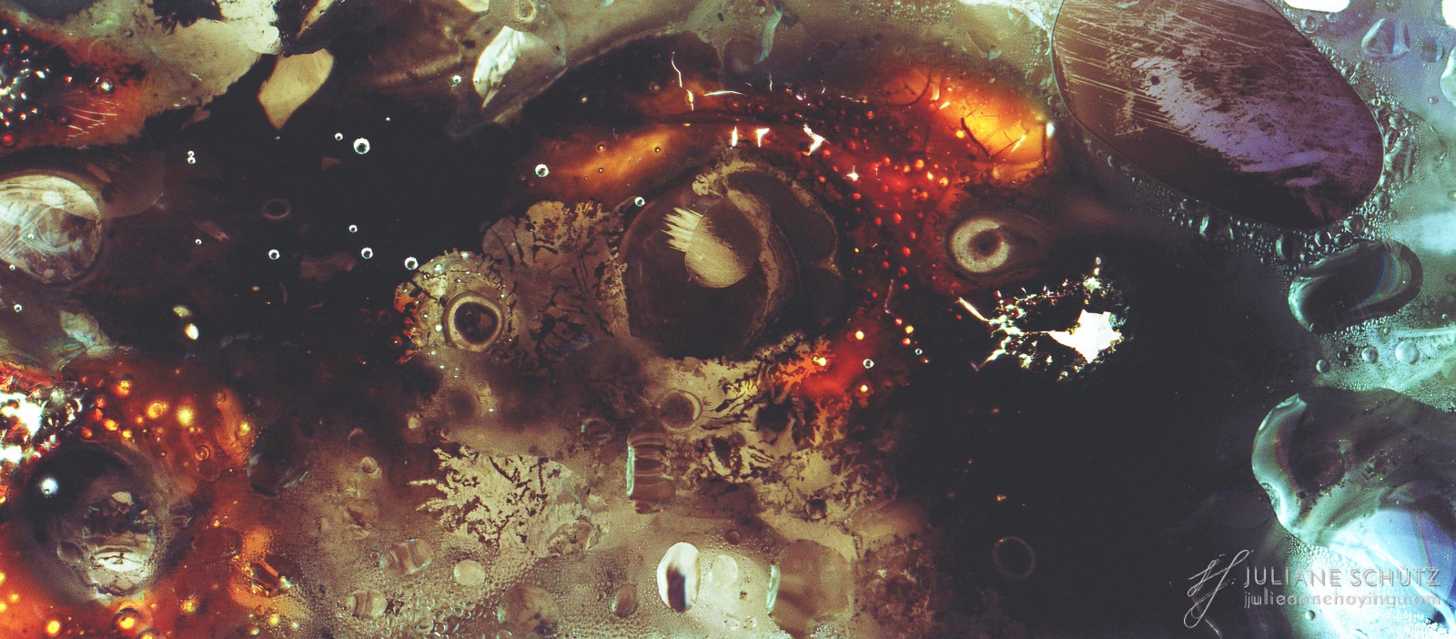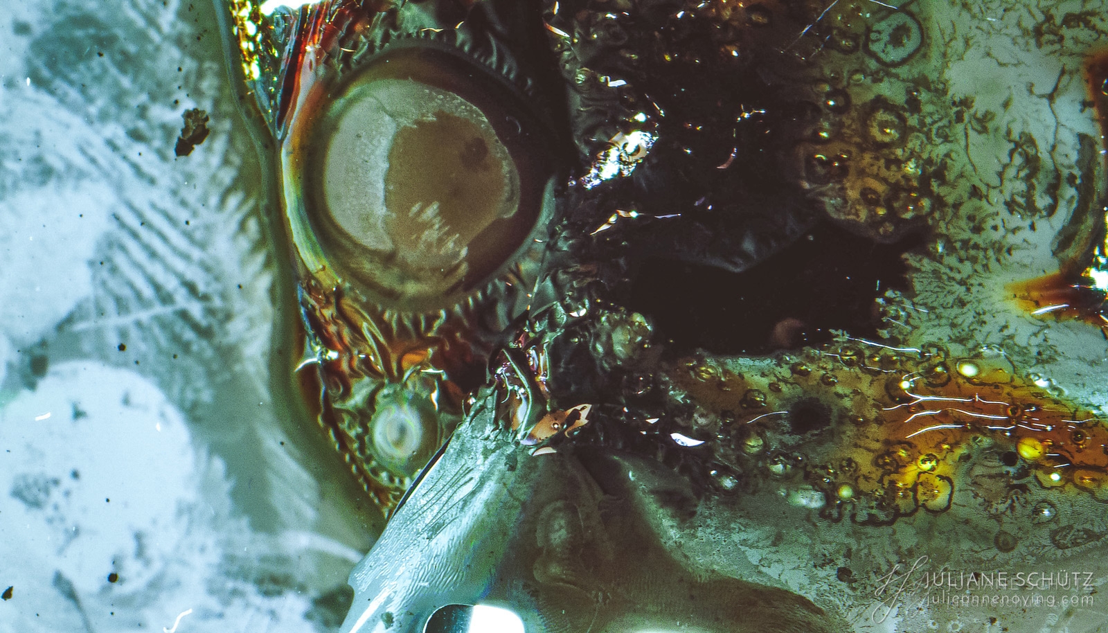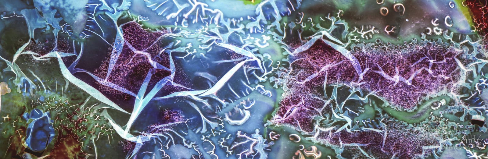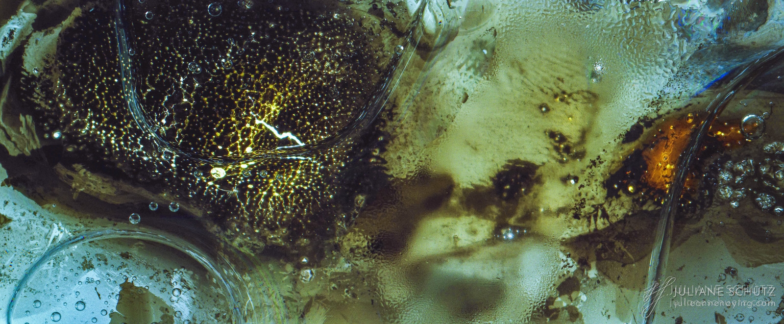 In contrast to normal use where the film is used as a canvas for a photographer's vision of the world, Schütz explores a new and different form of "life" by allowing the film to develop its own form of expression through analog manipulation using household chemicals such as ammonia, vodka, chlorine, acetone, soda and fire.