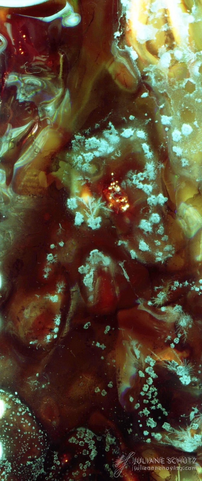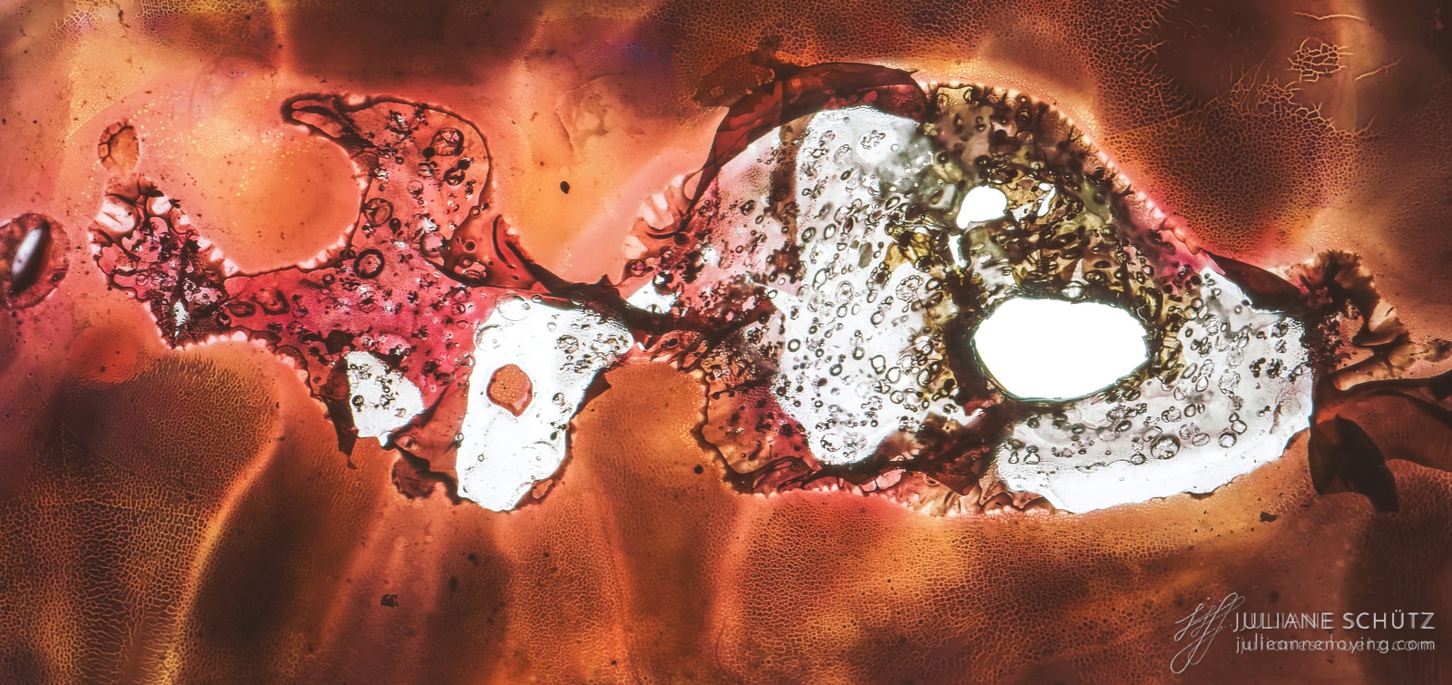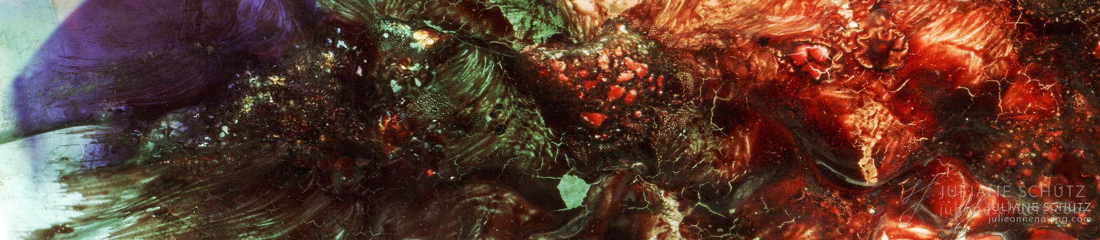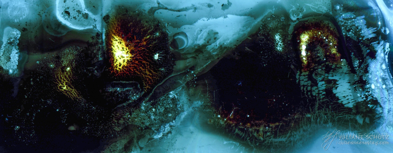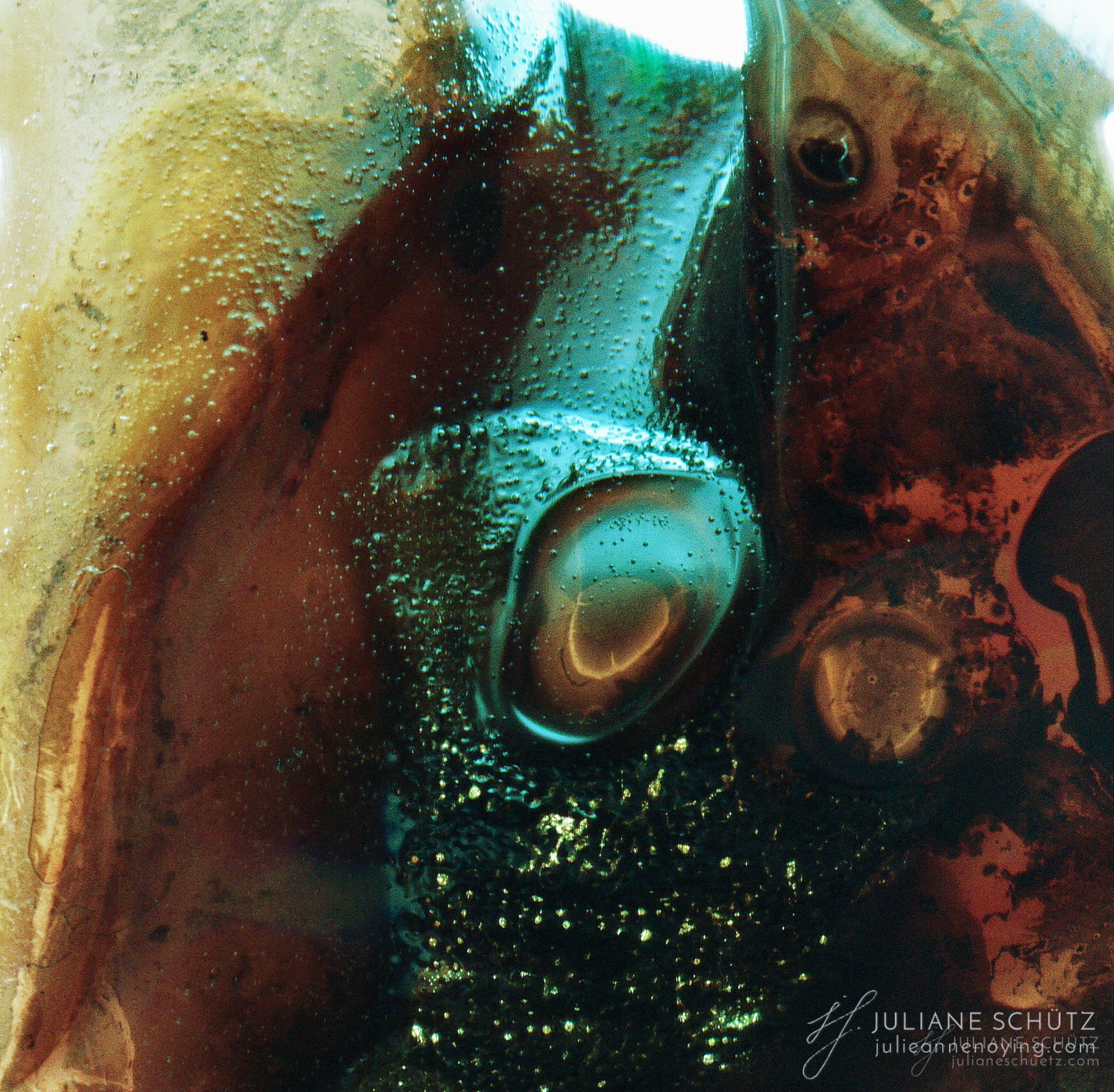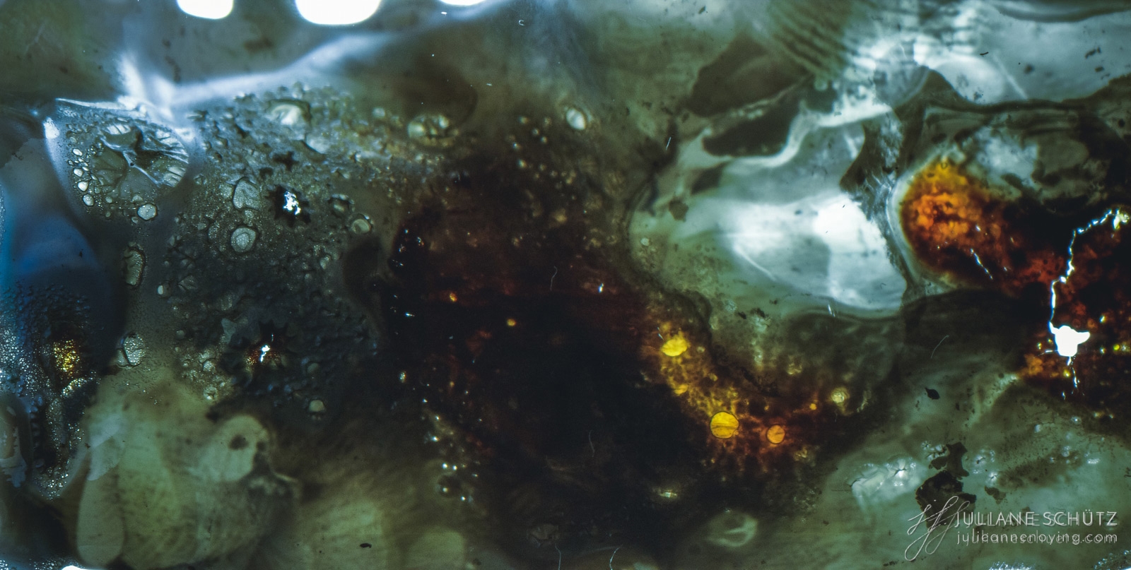 In contrast to normal use where the film is used as a canvas for a photographer's vision of the world, Schütz explores a new and different form of "life" by allowing the film to develop its own form of expression through analog manipulation using household chemicals such as ammonia, vodka, chlorine, acetone, soda and fire.
