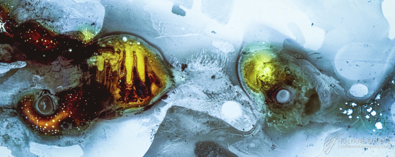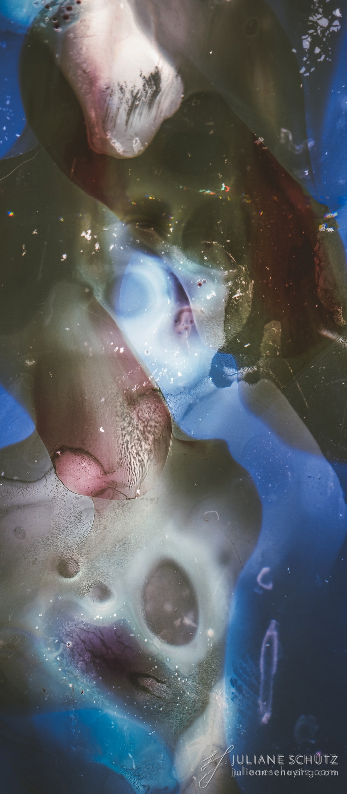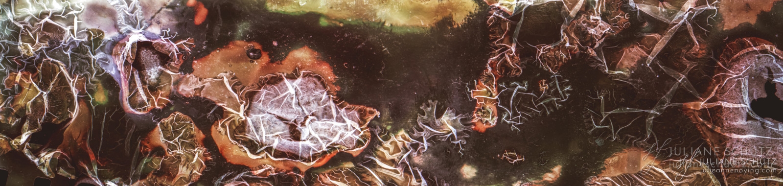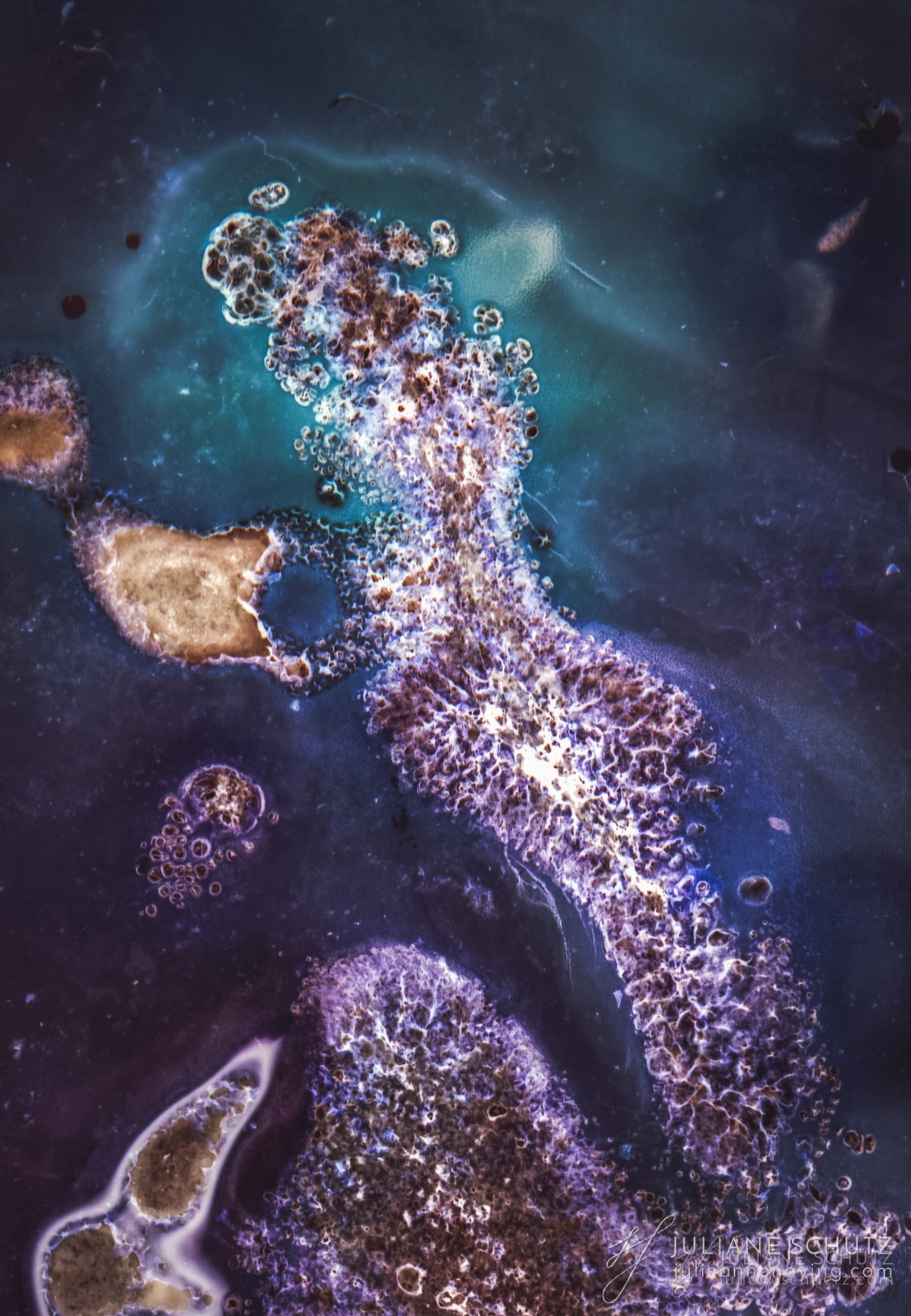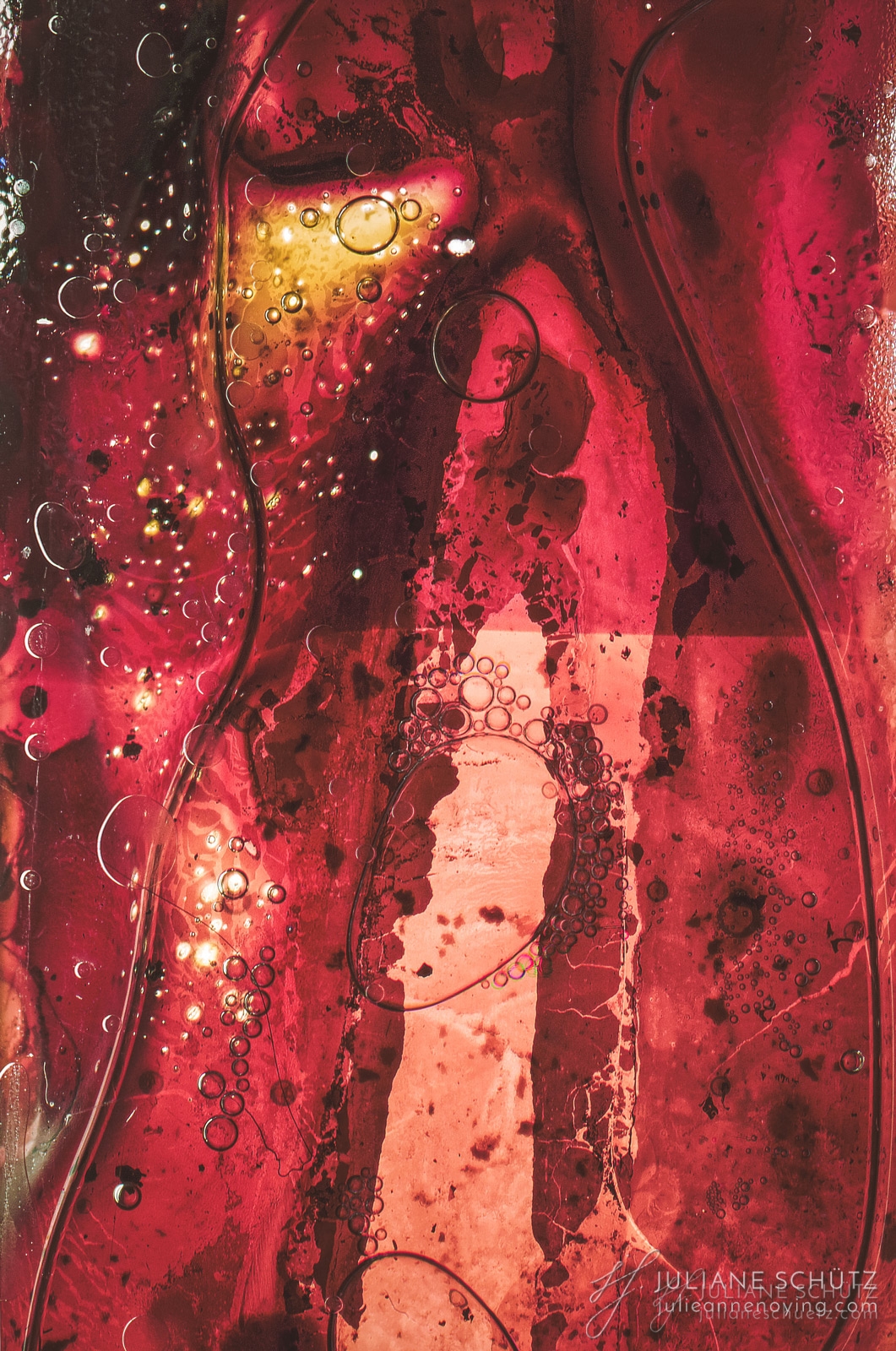 In contrast to normal use where the film is used as a canvas for a photographer's vision of the world, Schütz explores a new and different form of "life" by allowing the film to develop its own form of expression through analog manipulation using household chemicals such as ammonia, vodka, chlorine, acetone, soda and fire.