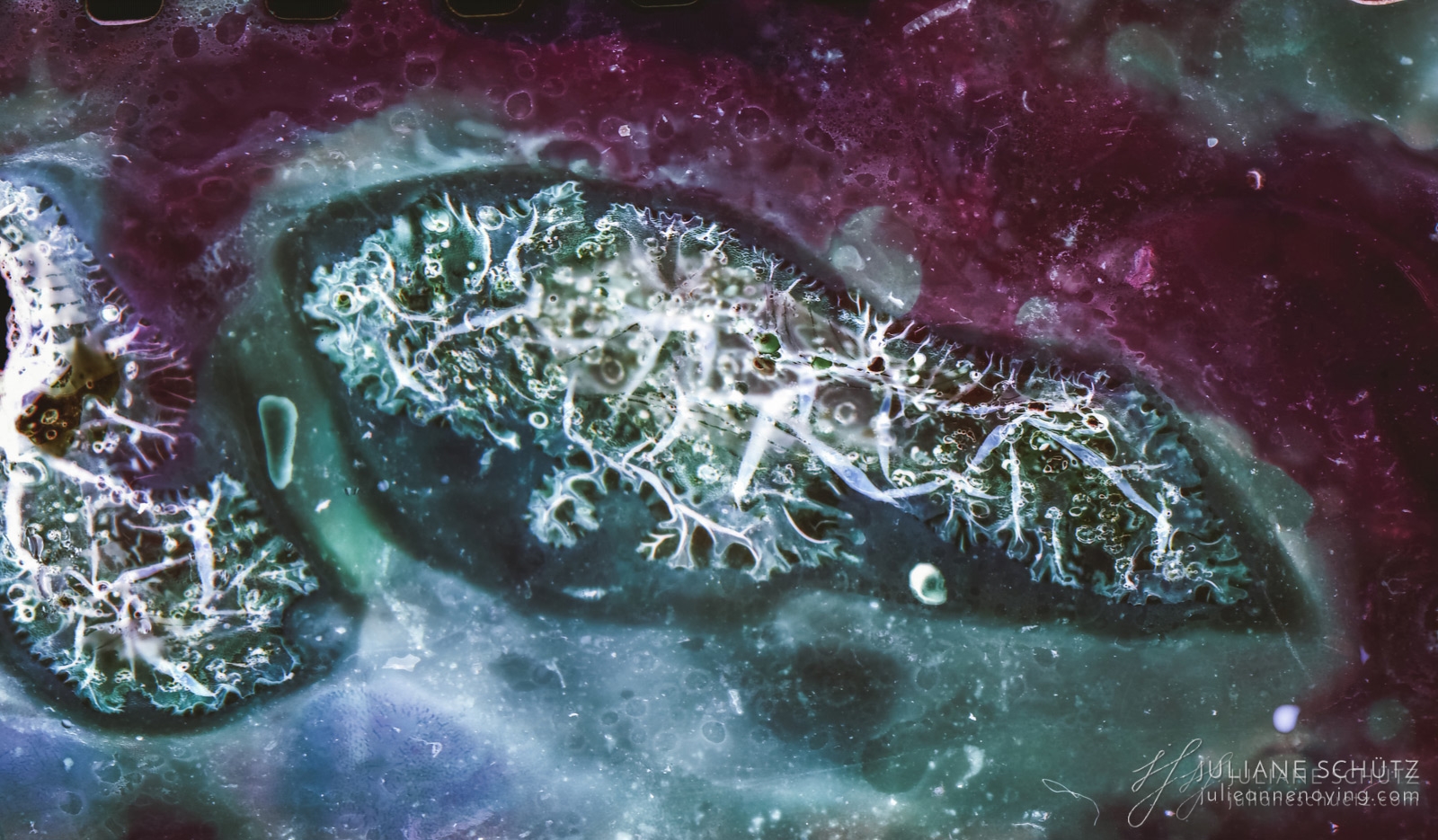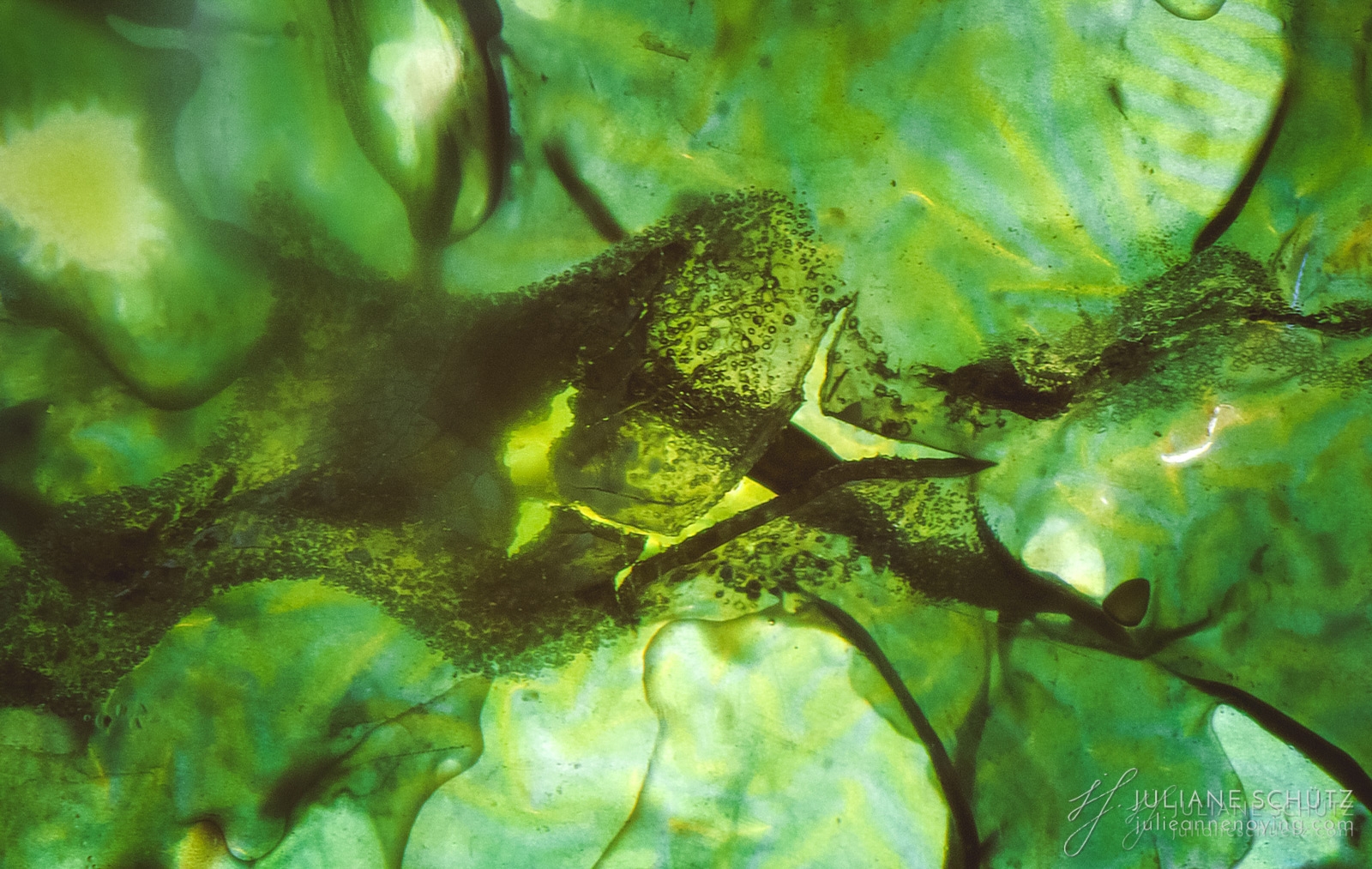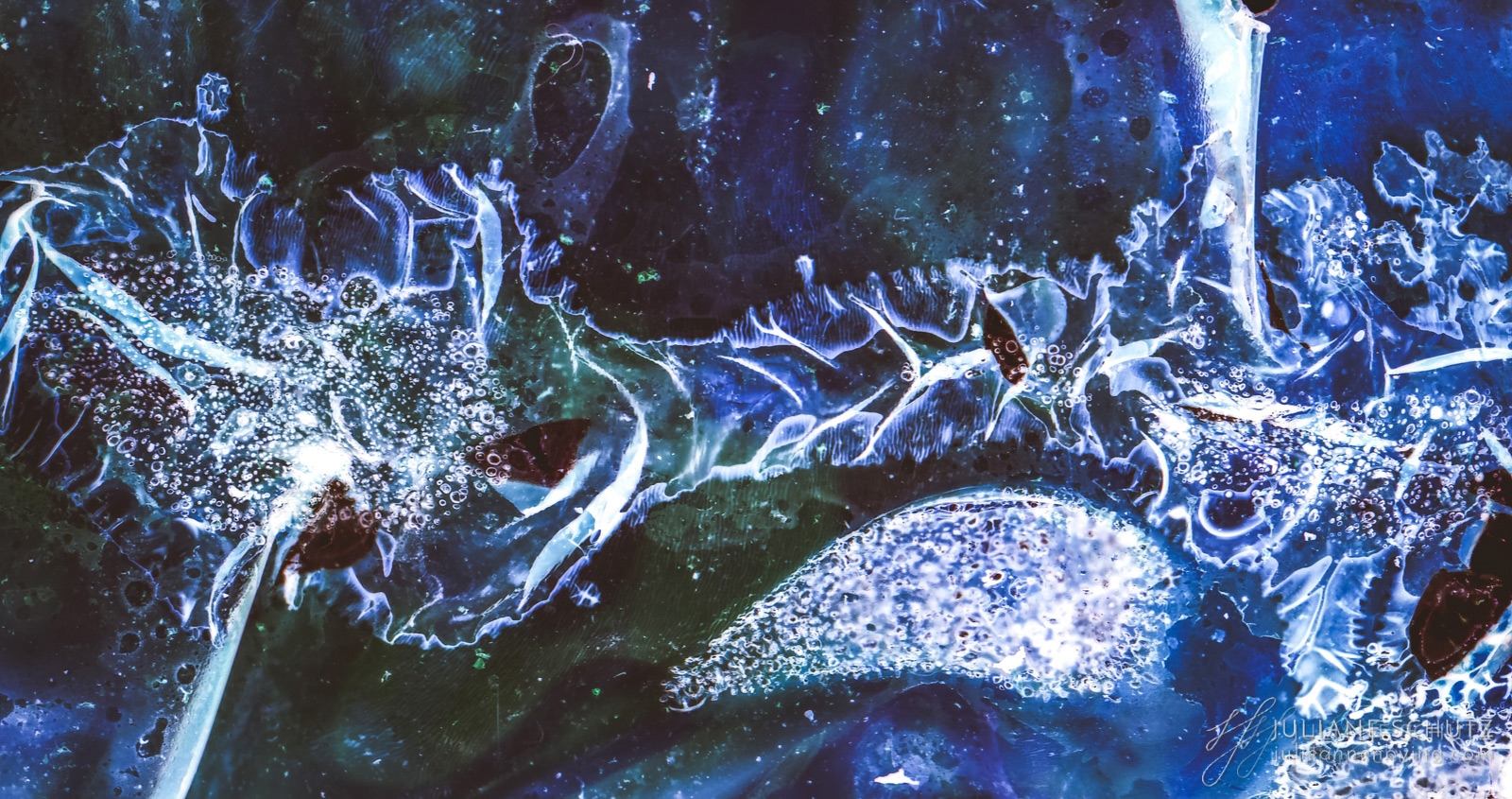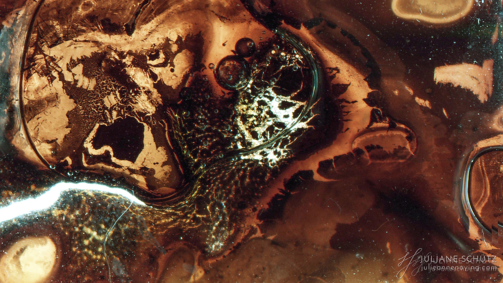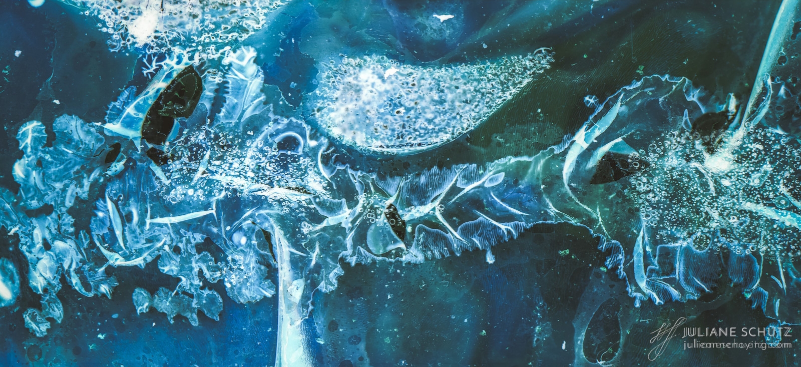 In contrast to normal use where the film is used as a canvas for a photographer's vision of the world, Schütz explores a new and different form of "life" by allowing the film to develop its own form of expression through analog manipulation using household chemicals such as ammonia, vodka, chlorine, acetone, soda and fire.
